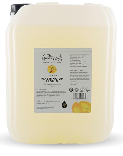 Greenscents Washing Up Liquid is available in 500 ml amber glass bottles with aluminium caps. We recommend this product is used with our 500 ml pump head. Our 5 litre and 20 litre refill options are available in UN approved containers made from HDPE.