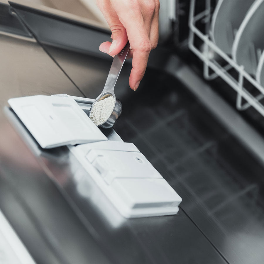 Fill the rinse aid compartment with organic white vinegar and add dishwasher salt as needed to help prevent limescale build-up.