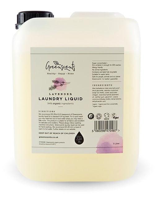 Greenscents Organic Laundry Liquid is made with certified organic soap nuts and shikakai pods for the most sensitive households. Non-biological and free from SLS, enzymes, optical brighteners and artificial fragrances (choose Nonscents for newborns and allergy sufferers), it’s perfect for baby clothes, cloth nappies and pet or children’s bedding. 100% biodegradable, cruelty-free and Soil Association certified, clean you can trust.