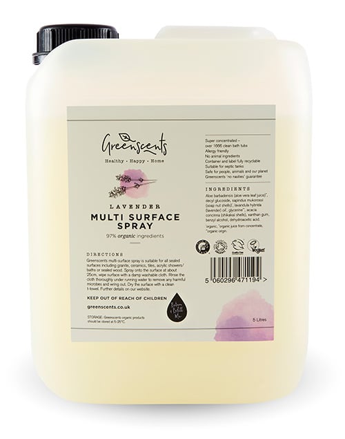 Greenscents Multi Surface Sprays are available in 500 ml amber glass bottles with aluminium caps. We recommend this product is used with our 500 ml spray head. Our 5 litre and 20 litre refill options are available in UN approved containers made from HDPE.