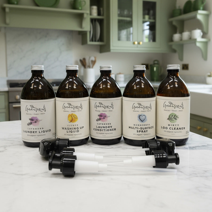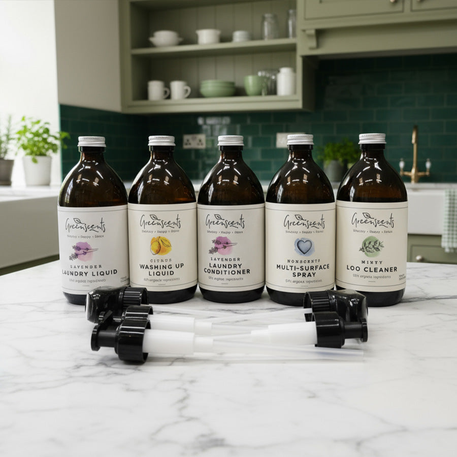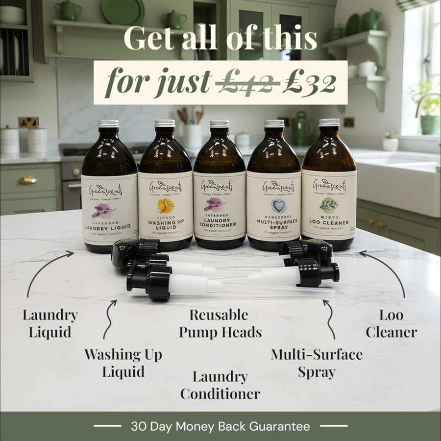 Make everyday cleaning safer and more sustainable with the Greenscents Discovery Set - a complete organic cleaning starter kit for laundry, dishes, surfaces and the bathroom. This eco-friendly bundle includes five bestselling full-size products: Laundry Liquid (Lavender), Laundry Conditioner (Lavender), Washing Up Liquid (Citrus), Multi-Surface Spray (Nonscents) and Loo Cleaner (Mint), plus three reusable pumps and two trigger sprays for easy dispensing.