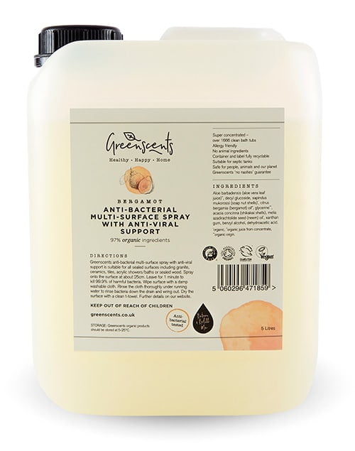 Greenscents Anti-Bacterial Multi Surface Spray with Anti-Viral Support is suitable for all sealed surfaces including granite, ceramics, tiles, acrylic showers/baths or sealed wood. Spray onto the surface at about 25cm. Leave for 1 minute to kill 99.9% of harmful bacteria. Wipe surface with a damp washable cloth.