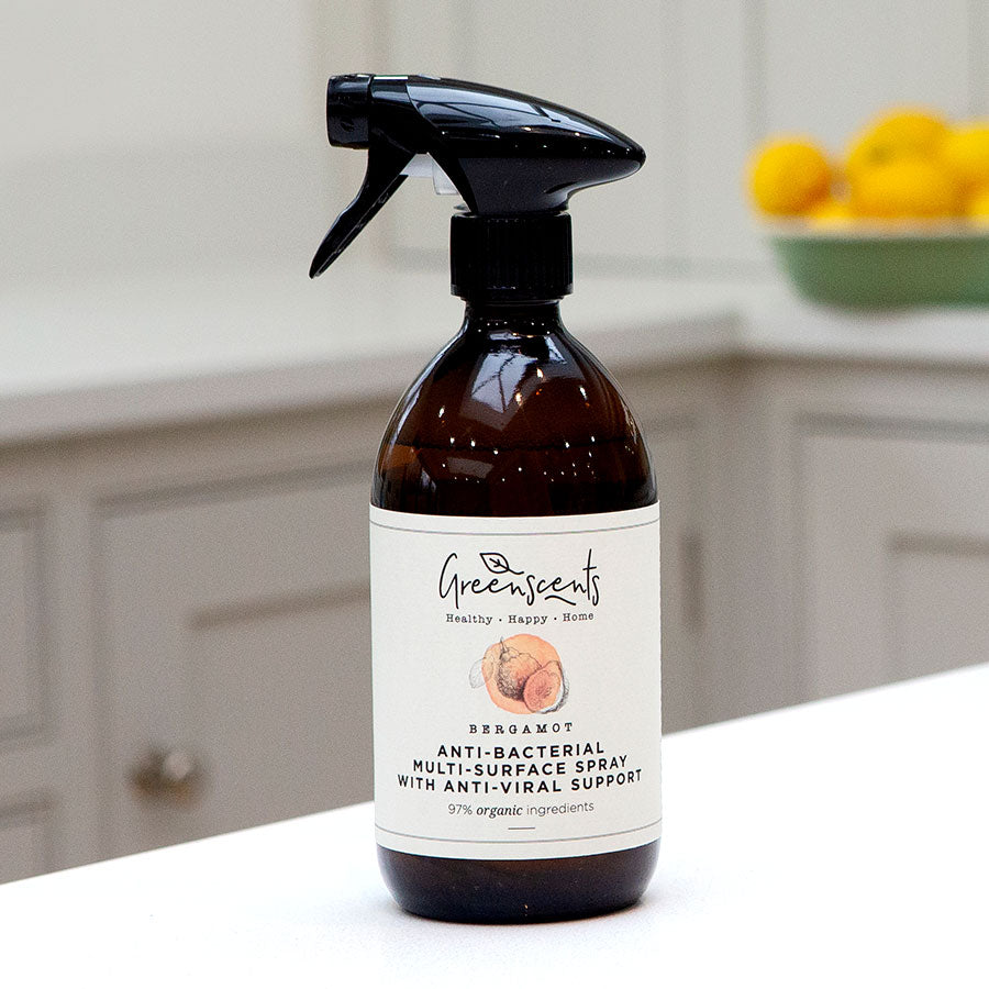 Greenscents Anti-Bacterial Multi Surface Spray with Anti-Viral Support is available in 500 ml amber glass bottles with aluminium caps.